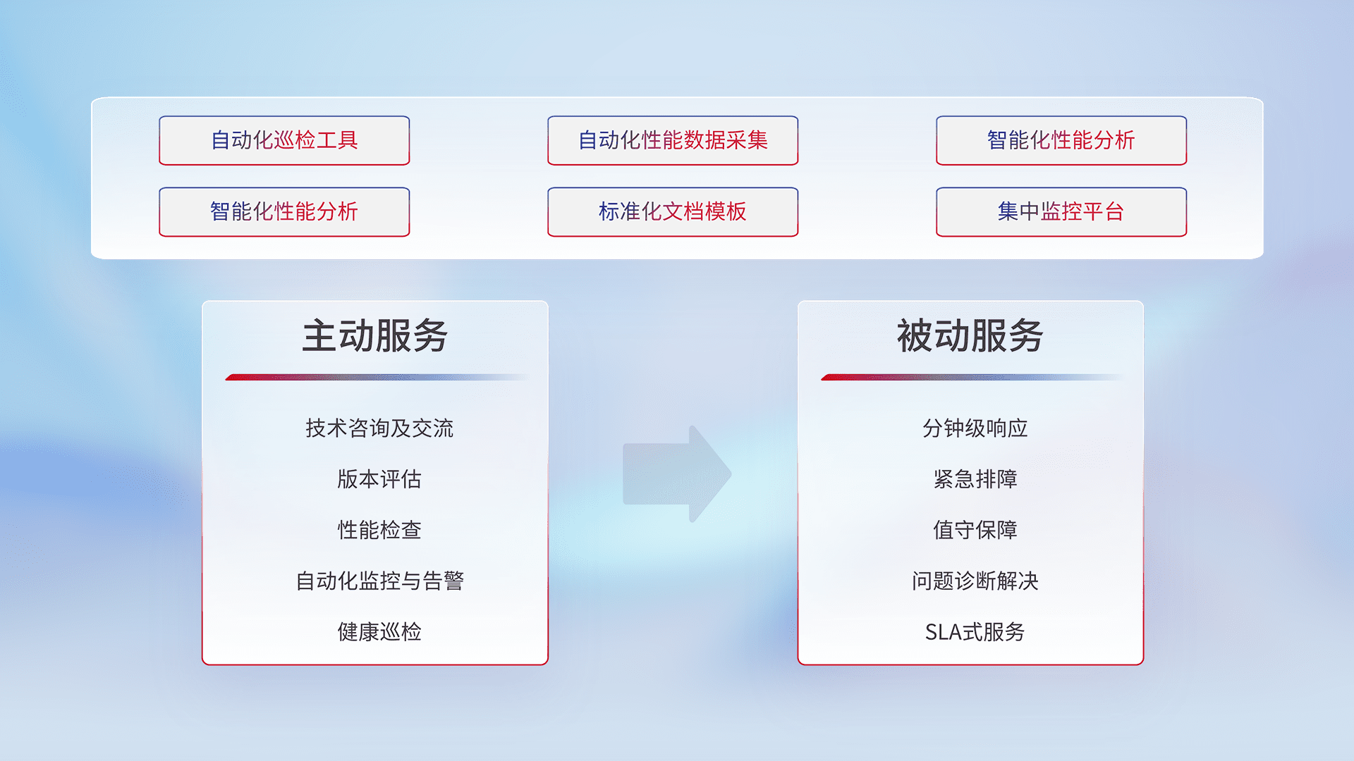 智能化工具和标准化文档,,,保障服务质量,,,提供主动服务(包含技术咨询、、版本评估、、、、性能检查、、自动化监控与告警、、、、健康巡检)和被动服务包含(分钟级响应、、、紧急排障、、、、值守保障、、、、问题诊断解决、、SLA服务)。。。。